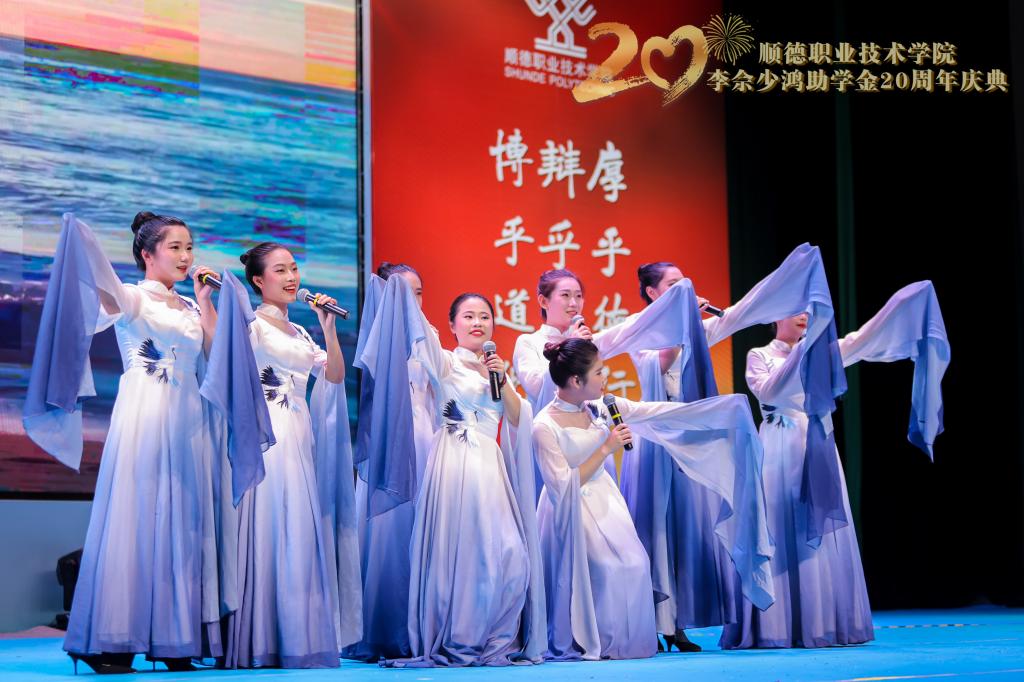 在李佘少鸿助学金二十周年庆典活动上,顺德凤岭老年大学的艺术家们和威尼斯官网师生表演舞蹈《领航》、歌曲独唱《苹果香》《如愿》、钢琴演奏《彩云追月》、诗歌朗诵《滴水之恩 涌泉相报》、歌曲合唱《渔家姑娘在海边》《感恩的心》等精彩节目。